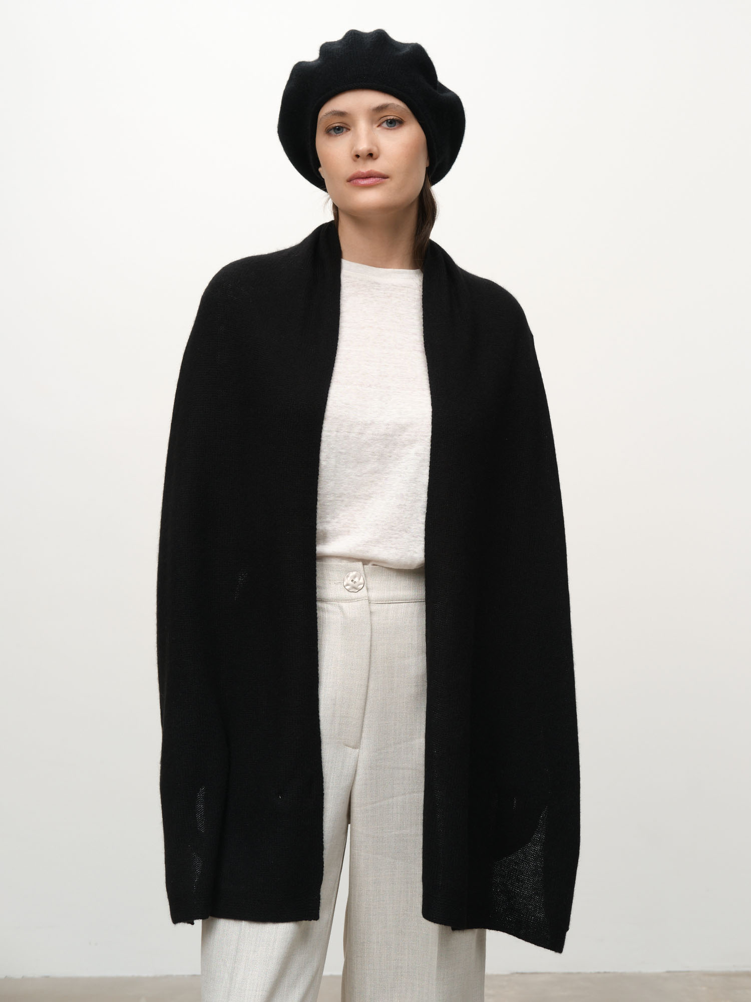 Черный кашемировый шарф – это минимализм с оттенком аристократизма. Его цвет – не просто нейтральный, а глубокий, насыщенный, как ночное небо, способный придать образу загадочность и строгость одновременно. Он не кричит о себе, но мгновенно поднимает статус любого наряда. Невесомый, но греющий – кашемир в 8 раз теплее овечьей шерсти, но при этом воздушный, как облако.