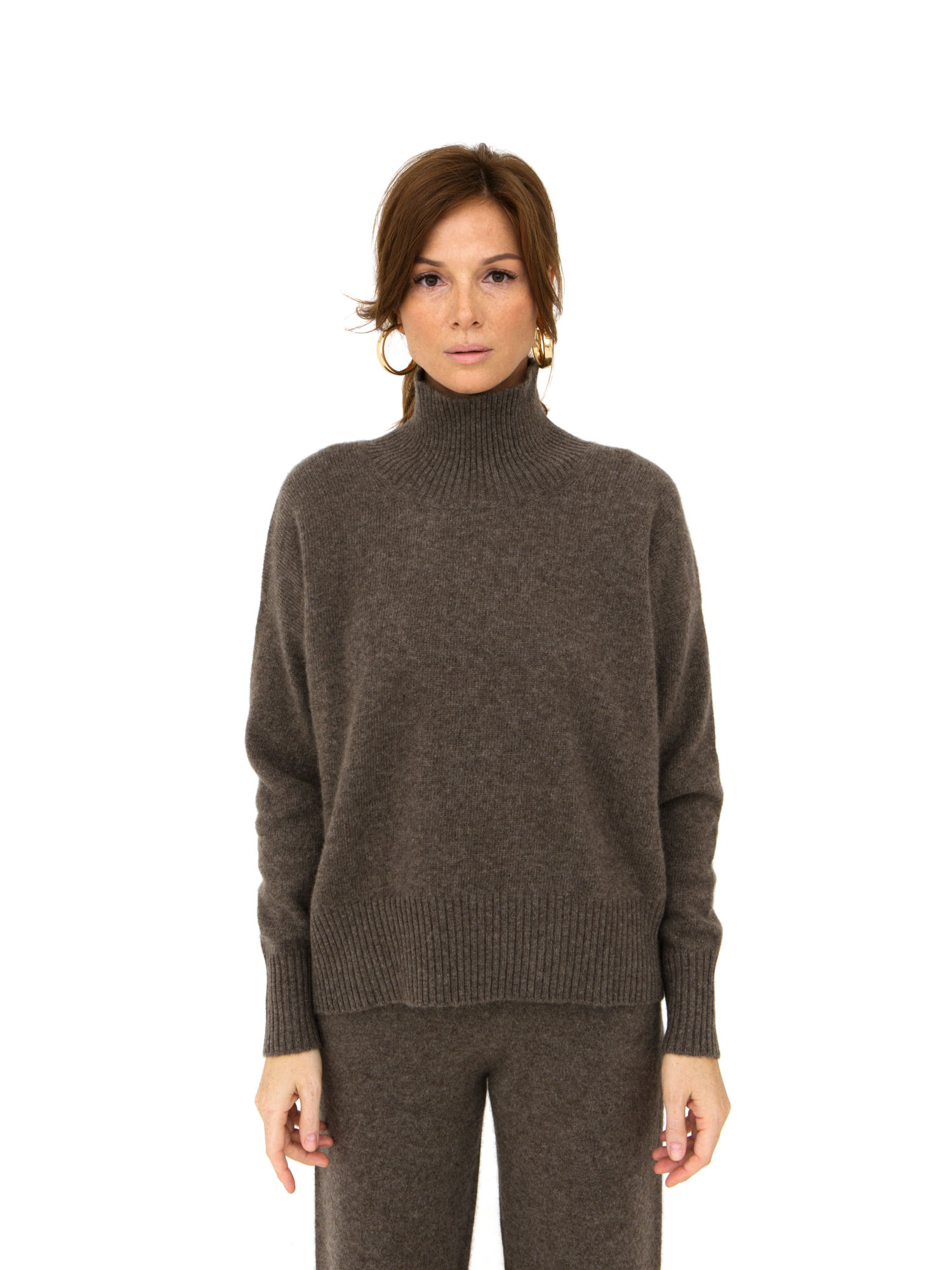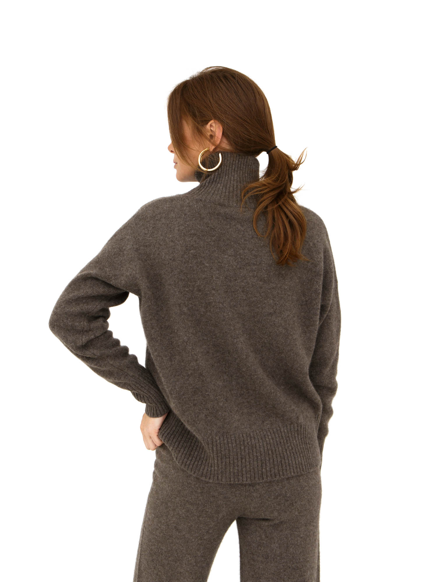 Модель выполнена в минималистичном стиле с высоким воротником и гладкой вязкой. Прямой силуэт и лаконичные линии подчёркивают благородную текстуру натурального материала.
