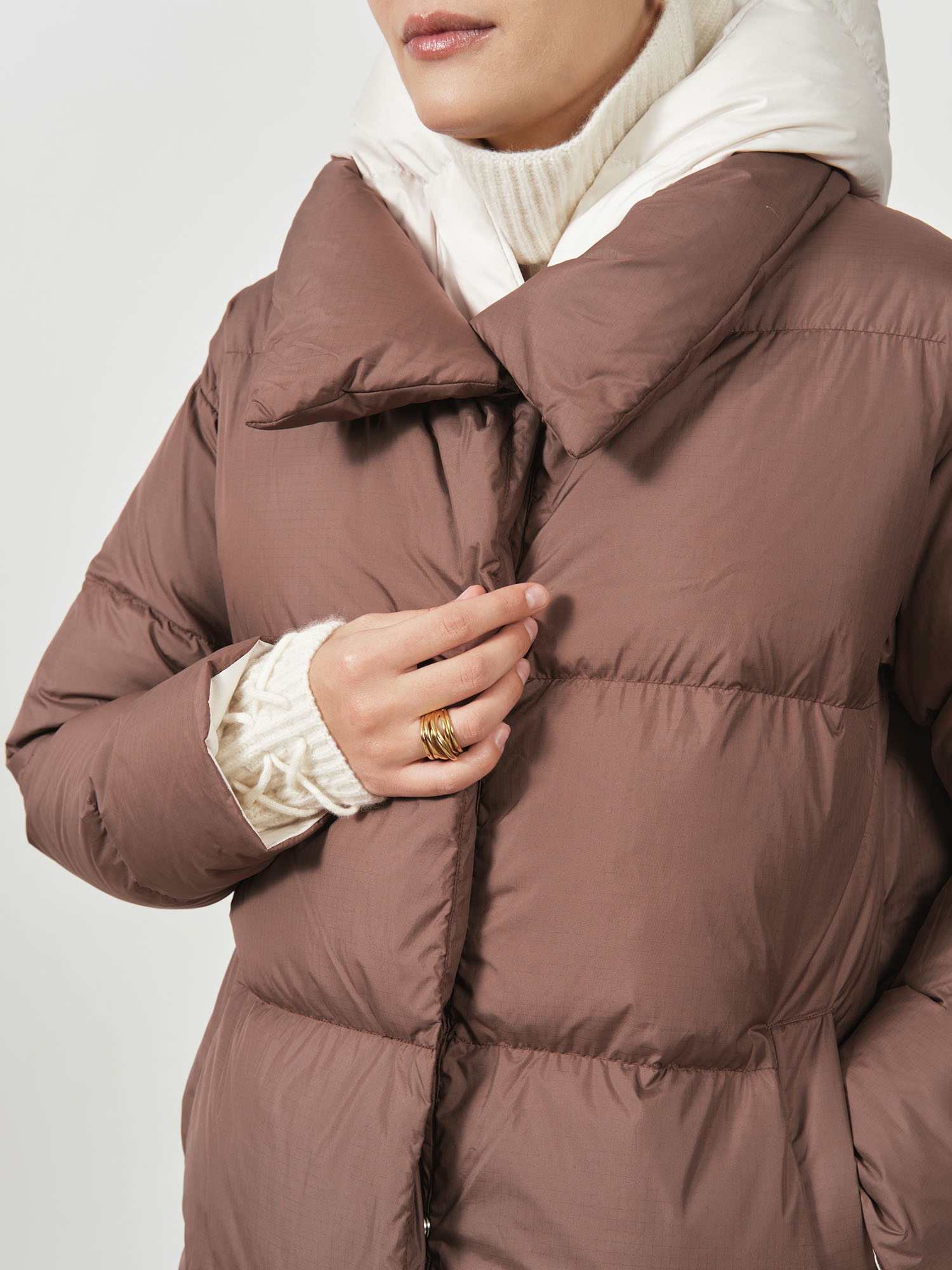 Объёмный высокий воротник-стойка защищает шею от ветра и холода, создаёт уют и добавляет модели современный характер.