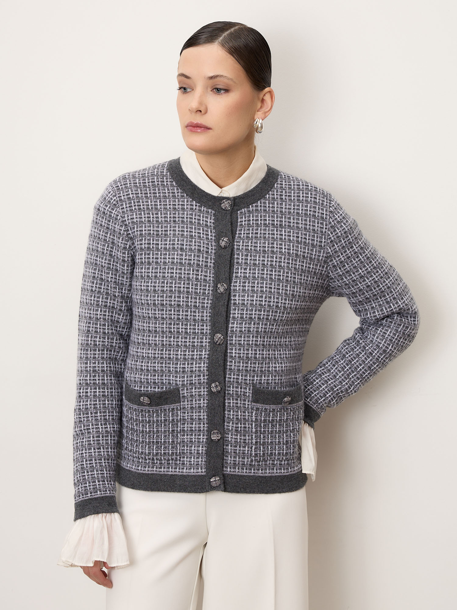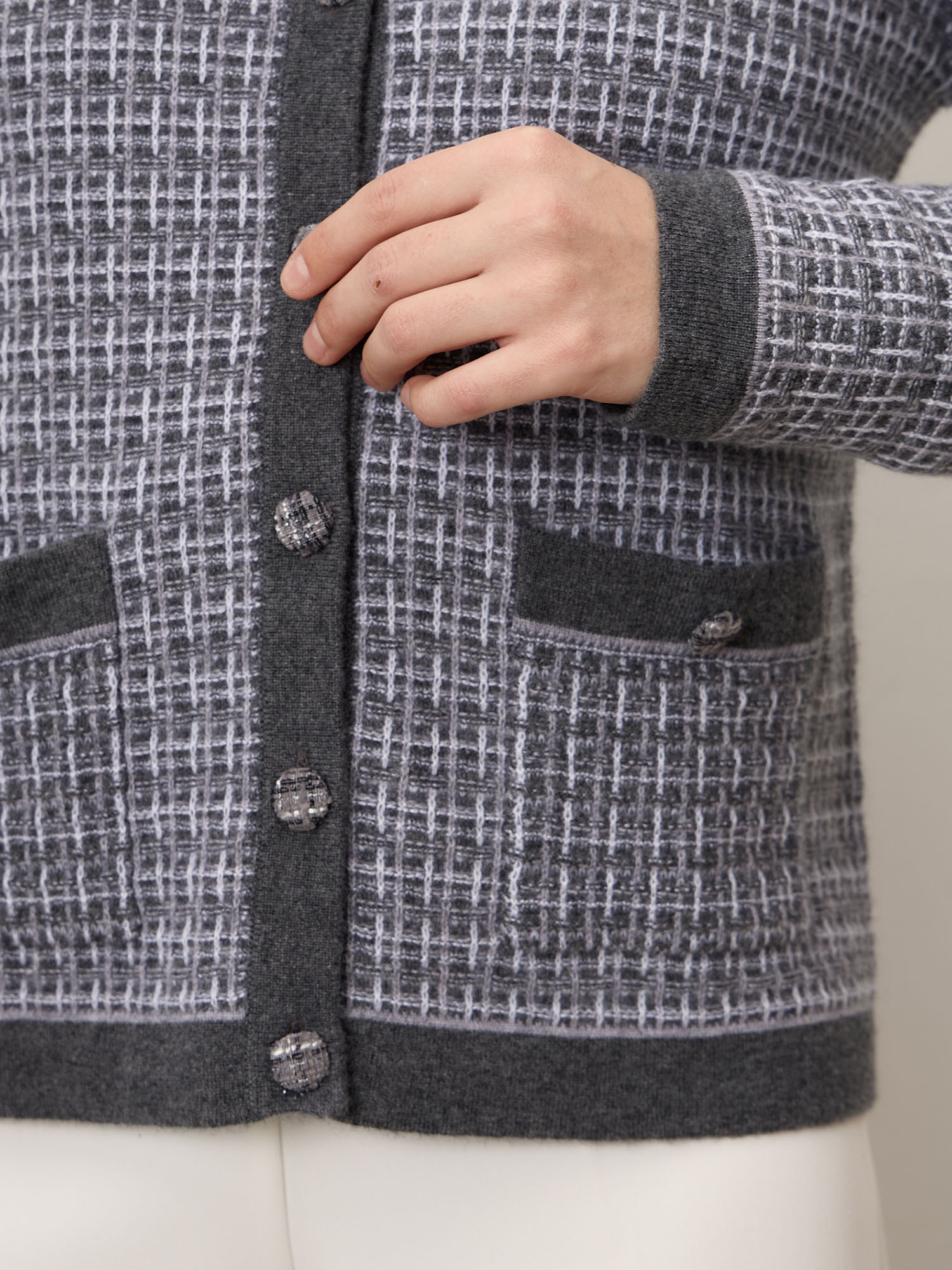 Премиальный кардиган из 100% монгольского кашемира в изысканном сером оттенке. Фактурная вязка и контрастная отделка создают элегантный, современные силуэт. Мягкий, тёплый и гипоаллергенный, он идеально подходит как для офиса, так и для повседневного стиля.